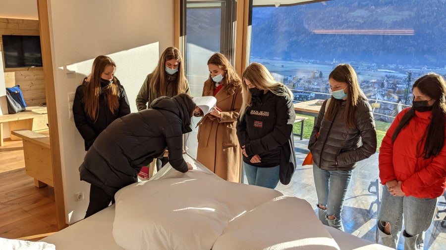 Der ‚Urlaub auf dem Bauernhof‘ ist ein tragendes Element in der Hauswirtschaftsschule Dietenheim. „Sowohl im Fach Agrotourismus als auch in der Raumgestaltung und im Bereich Housekeeping werden unsere Schülerinnen gezielt auf die Führung eines Betriebes mit ‚Urlaub auf dem Bauernhof‘ vorbereitet“, erklären Elisabeth Hitthaler und Helga Pöhl. Beide sind Lehrpersonen für Housekeeping und Wäschepflege und federführend bei der Organisation und Durchführung der Exkursion der Klasse 3 HW zum Innermoserhof in Mühlen in Taufers.