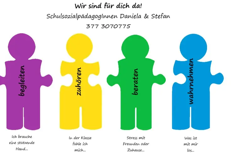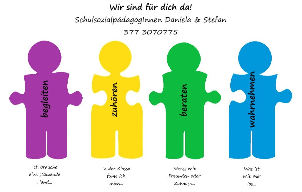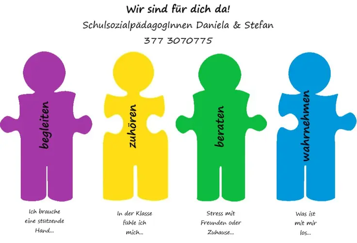 … sind Anlaufstelle für Schülerinnen und Schüler, Eltern und Lehrpersonen und beraten/vermitteln bei individuellen Problemen (Mobbing, Versagens- und Schulangst, mangelndes Selbstwertgefühl …)